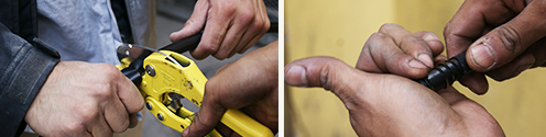 En el extremo opuesto de la manguera de un metro, coloca una pieza T y une en cada extremo de la pieza una manguera de 2m, en la manguera paralela a la anterior coloca otro tapón. En las dos líneas paralelas, realizaremos los orificios para los goteros con ayuda de un ponchador mecánico. Inserta con cuidado cada gotero, se coloca uno por cada columna de bolsas. |